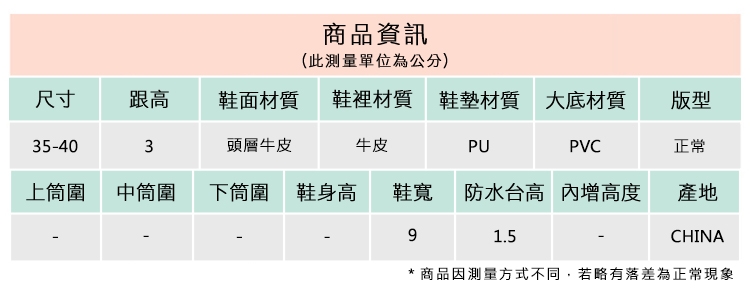 2.鞋類商品依功能及用途之不同,鞋底各有其止滑係數之個別不同,使用鞋類商品請用於正常平坦之路面,非雨鞋或雨靴類商品,請避免穿著於下雨濕滑路面上行走。