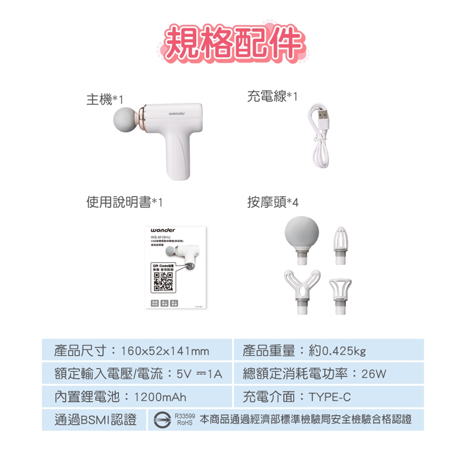 配件:球形按摩頭*1、 U型按摩頭*1、 A型按摩頭*1、 小平頭按摩頭*1、使用說明書(含保證書)*1、 USB充電線*1