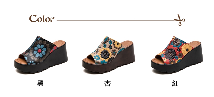 【VECCHIO】真皮彩色花朵皮雕厚底坡跟拖鞋/真皮頭層牛皮立體彩色花朵手工皮雕鬆糕厚底坡跟拖鞋 女鞋 黑