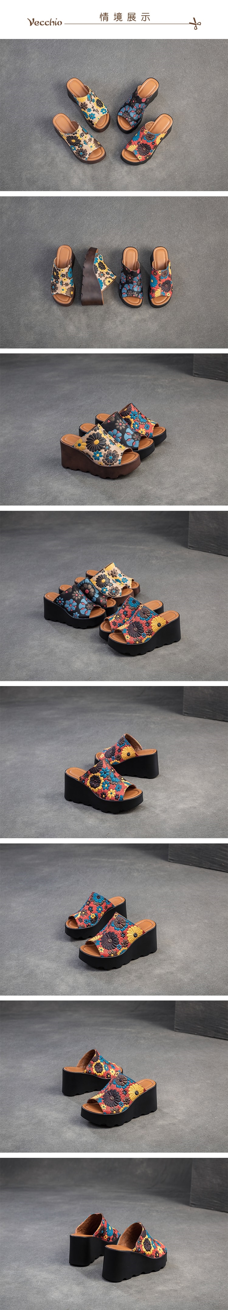 【VECCHIO】真皮彩色花朵皮雕厚底坡跟拖鞋/真皮頭層牛皮立體彩色花朵手工皮雕鬆糕厚底坡跟拖鞋 女鞋 紅