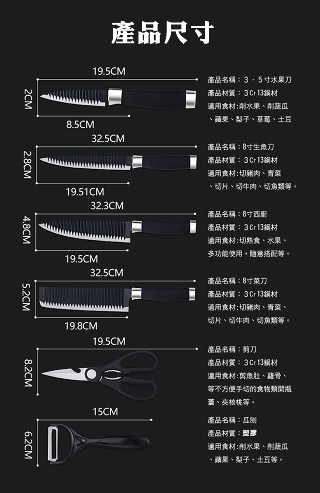 內 容 物:切片刀、切肉刀、廚師刀、 水果刀、剪刀、刨刀
