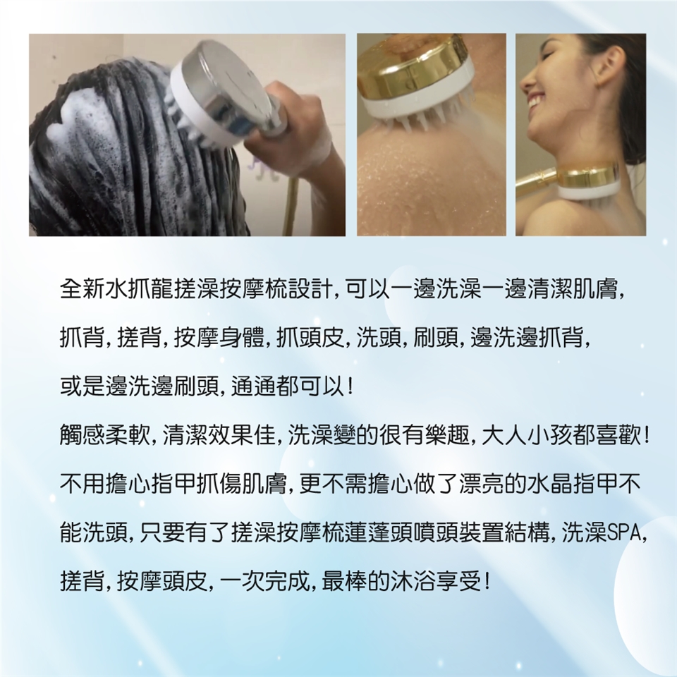 一邊洗澡一邊清潔肌膚, 抓背, 搓背, 按摩身體,抓頭皮,洗頭,刷頭,邊洗邊抓