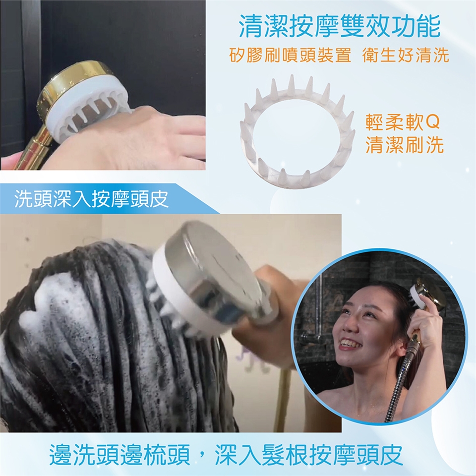商品組合:水摩爾 水抓龍 SPA 按摩刷過濾 蓮蓬頭 1組(含濾芯、矽膠軟刷頭、軟管各1)