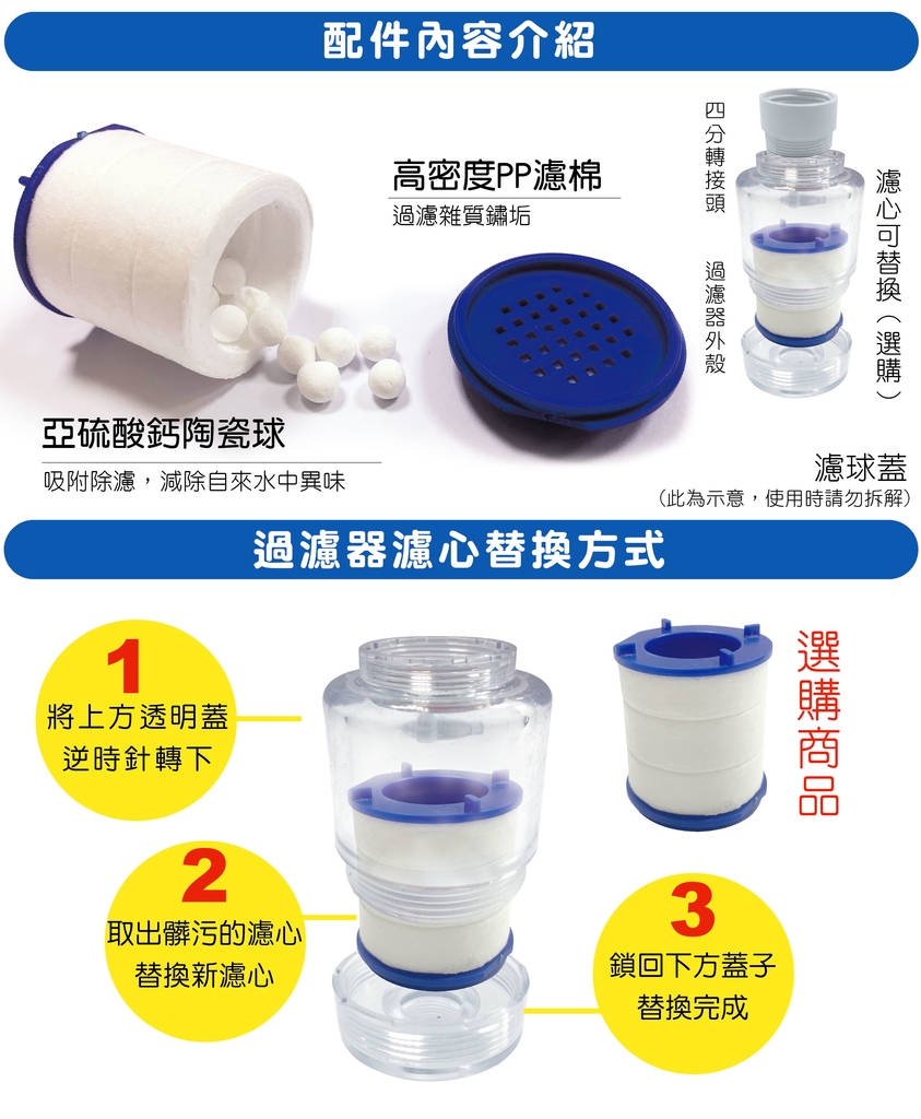 過濾器上方轉接頭為衛浴通用規格,四分粗內牙,下方出水口為四分粗外牙,適用衛浴龍頭或蓮蓬頭安裝。