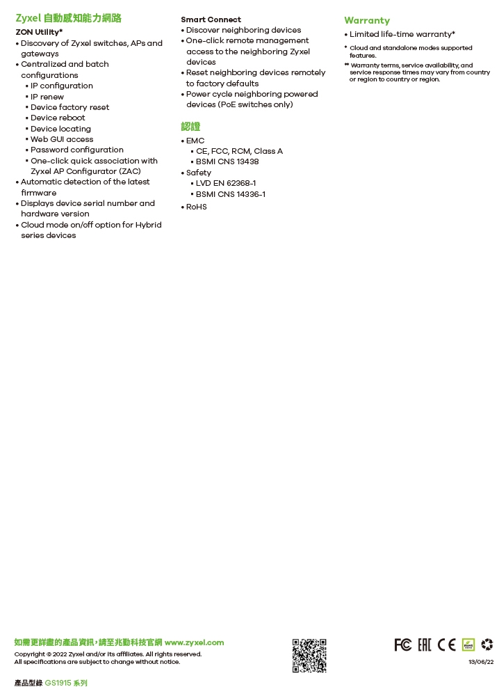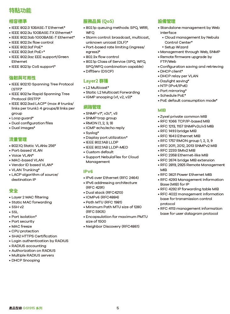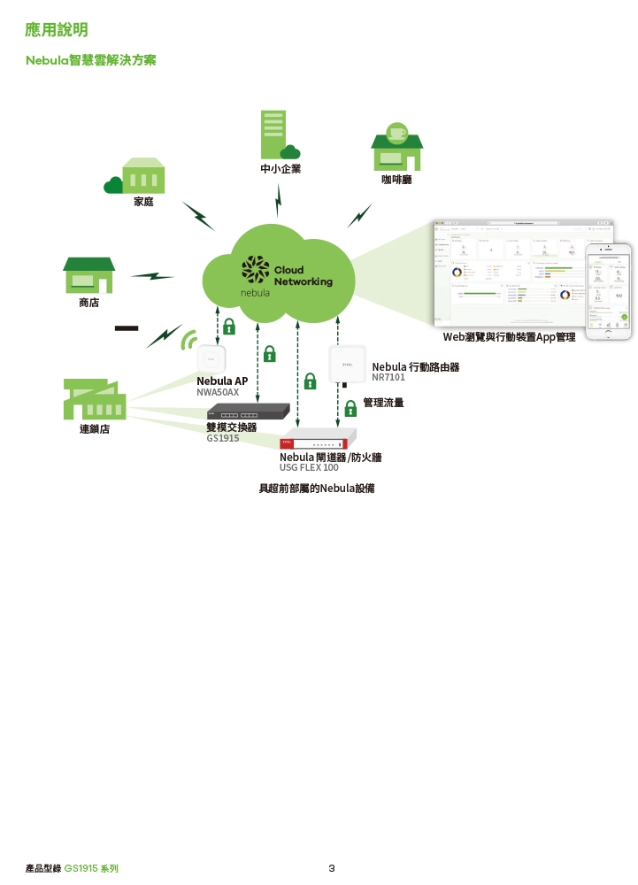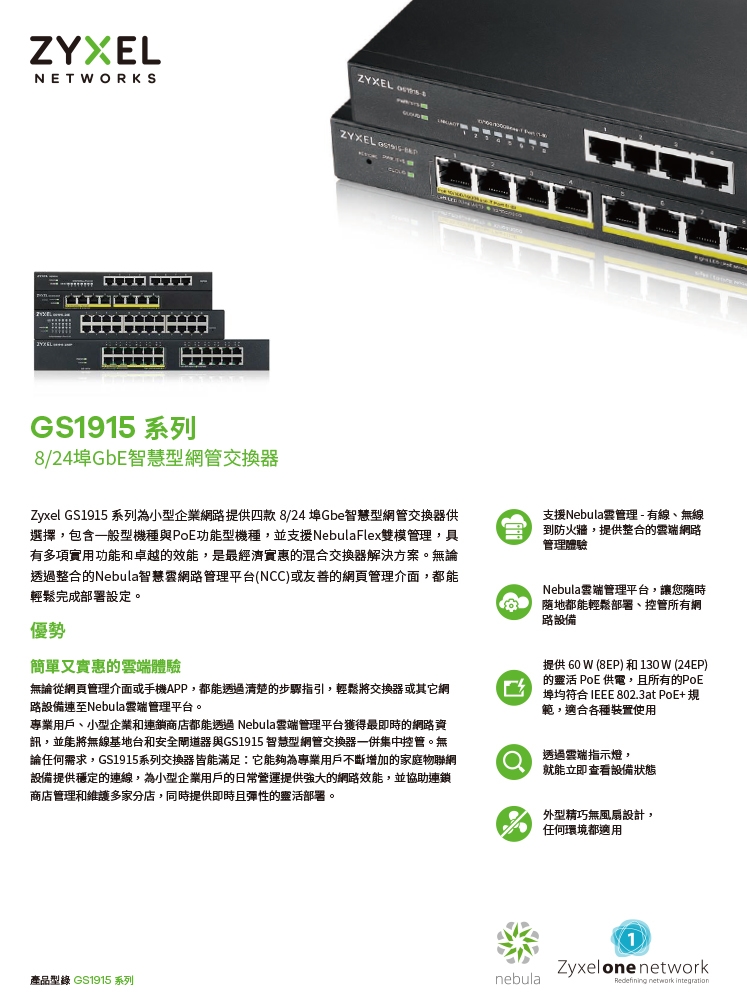 無論從網頁管理介面或手機APP,都能透過清楚的步驟指引,輕鬆將交換器或其它網路設備連至Nebula雲端管理平台。專業用戶、小型企業和連鎖商店都能透過 Nebula雲端管理平台獲得最即時的網路資訊,並能將無線基地台和安全閘道器與GS1915智慧型網管交換器一併集中控管。無論任何需求,GS1915系列交換器皆能滿足:它能夠為專業用戶不斷增加的家庭物聯網設備提供穩定的連線,為小型企業用戶的日常營運提供強大的網路效能,並協助連鎖商店管理和維護多家分店,同時提供即時且彈性的靈活部署。