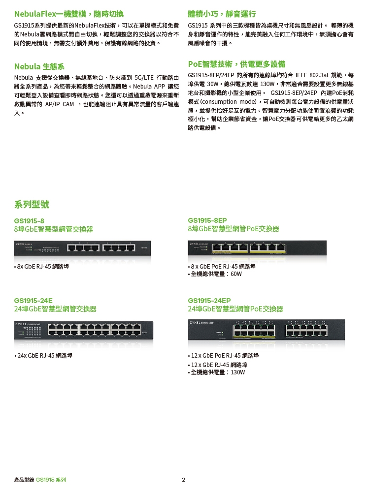 無論從網頁管理介面或手機APP,都能透過清楚的步驟指引,輕鬆將交換器或其它網路設備連至Nebula雲端管理平台。專業用戶、小型企業和連鎖商店都能透過 Nebula雲端管理平台獲得最即時的網路資訊,並能將無線基地台和安全閘道器與GS1915智慧型網管交換器一併集中控管。無論任何需求,GS1915系列交換器皆能滿足:它能夠為專業用戶不斷增加的家庭物聯網設備提供穩定的連線,為小型企業用戶的日常營運提供強大的網路效能,並協助連鎖商店管理和維護多家分店,同時提供即時且彈性的靈活部署。