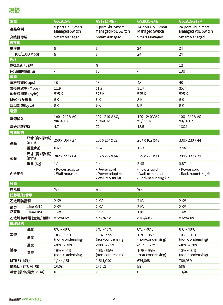 GS1915-8EP/24EP的所有的連線埠均符合IEEE 802.3at規範,每埠供電30W,總供電瓦數達130W,非常適合需要設置更多無線基地台和攝影機的小型企業使用。GS1915-8EP/24EP內建PoE消耗模式(consumption mode),可自動檢測每台電力設備的供電量狀態,並提供恰好足瓦的電力。智慧電力分配功能使閒置浪費的功耗極小化,幫助企業節省資金,讓PoE交換器可供電給更多的乙太網路供電設備。