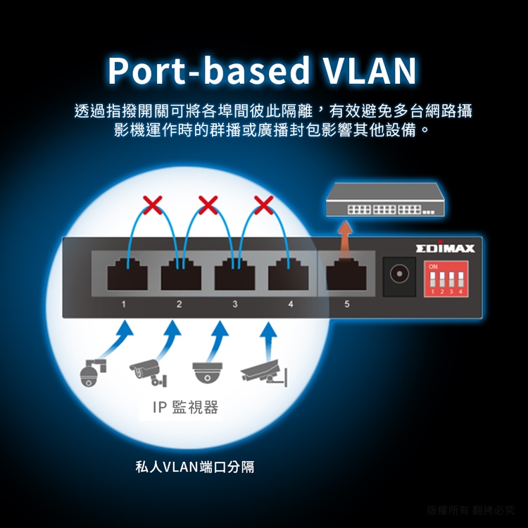 ◆Port-based VLAN,透過指撥開關可將各埠間彼此隔離