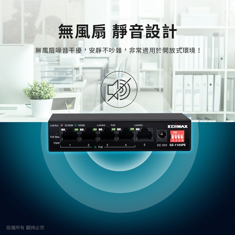 PoE 佈建方式靈活便利,耐用的金屬外殼、靜音無風扇設計,