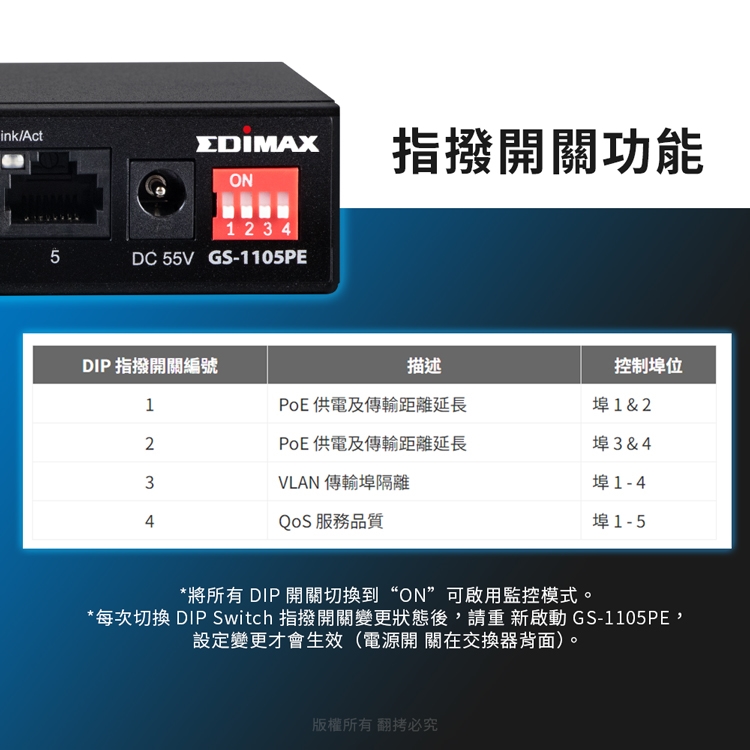 專為家庭或中小型網路環境使用而設計。簡單透過4個指撥開關(DIP Switch),