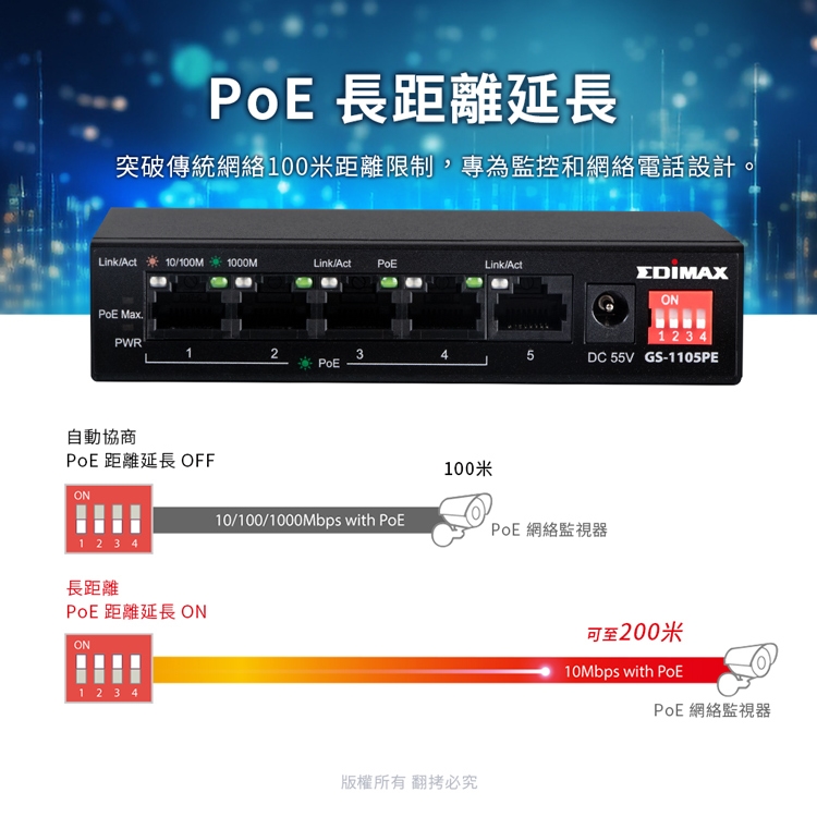 可手動設定來啟動,可將PoE 電力及資料傳輸距離延長至200公尺或更遠,