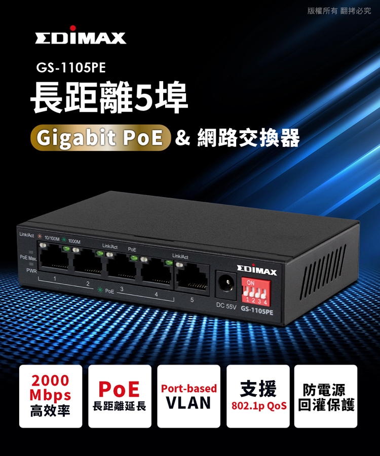 EDIMAX 訊舟 GS-1105PE 長距離5埠Gigabit PoE+網路交換器