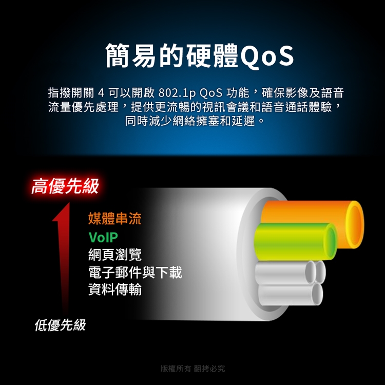 ◆支援 802.1p QoS功能,確保影像及語音流量優先處理
