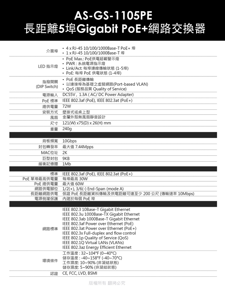 一款長距離5埠Gigabit PoE+千兆乙太網路交換器,提供Gigabit高速網路