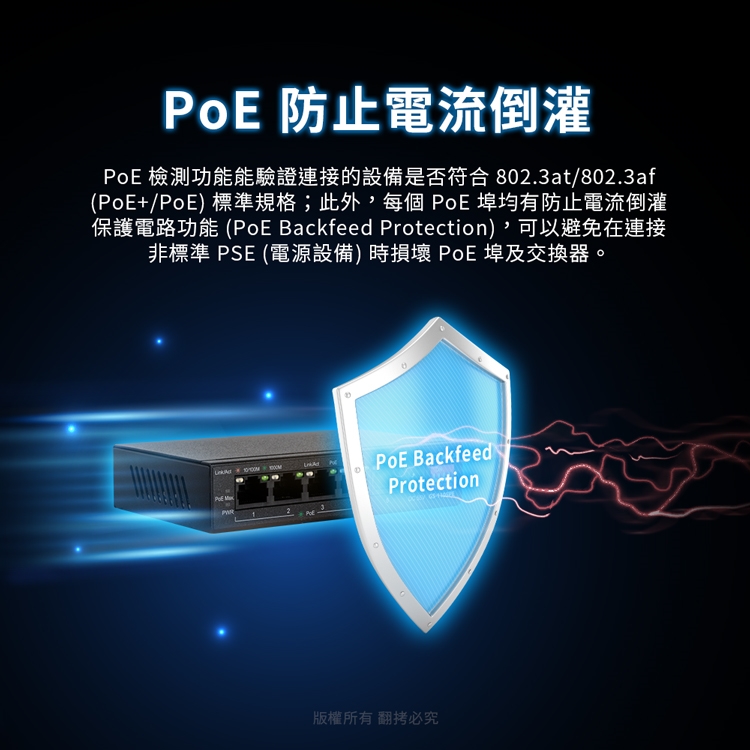 ◆PoE供電自動偵測,避免供電錯誤的損壞