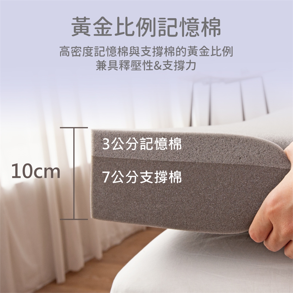 • 雲朵般Tencel 針織緹花布套搭配感溫記憶棉,側邊3D透氣網設計 可有效排出熱氣與溼氣,宿舍床墊首選,薄型10公分輕巧好方便,黃金比例內才採用3公分高密度記憶棉與7公分支撐棉,兼具釋壓性&支撐力,讓您全身保持理想姿勢就寢,每天再自然中安然入睡 享受一夜美夢