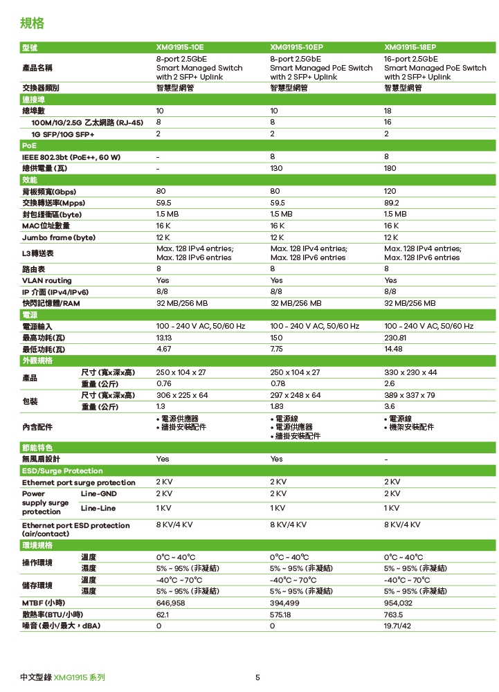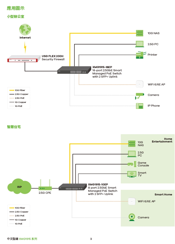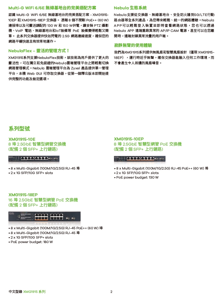 -XMG1915 全系列均提供2埠10G SFP+ ,採用全部 2.5G Multi-G 乙太網路埠,讓網路輕鬆升級2.5倍,具有PoE供電機種及 8埠和16埠 2.5G埠機種,依照需求彈性選擇。採用無風扇或智慧風扇設計,總能保持靜音運轉。輕巧俐落的外型,適合放置在各種場景使用,更支援Nebula雲端管理,讓你輕鬆掌握網路狀況。