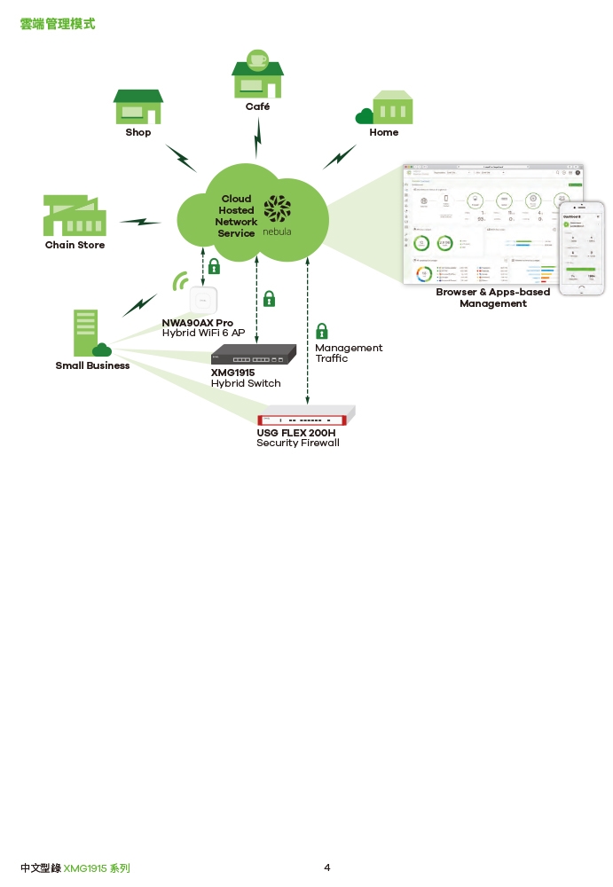 NebulaFlex 技術,該技術為用戶提供了更大的靈活性,可在獨立和免認證的 Nebula 雲端管理平台之間輕鬆切換網路管理模式。Nebula 提供直覺的 Web 介面和行動應用程式兩種使用模式,為您的網路安裝和管理提供簡化的體驗,無需額外支付軟體或硬體的費用,即可獲得簡易及完整的網路體驗。