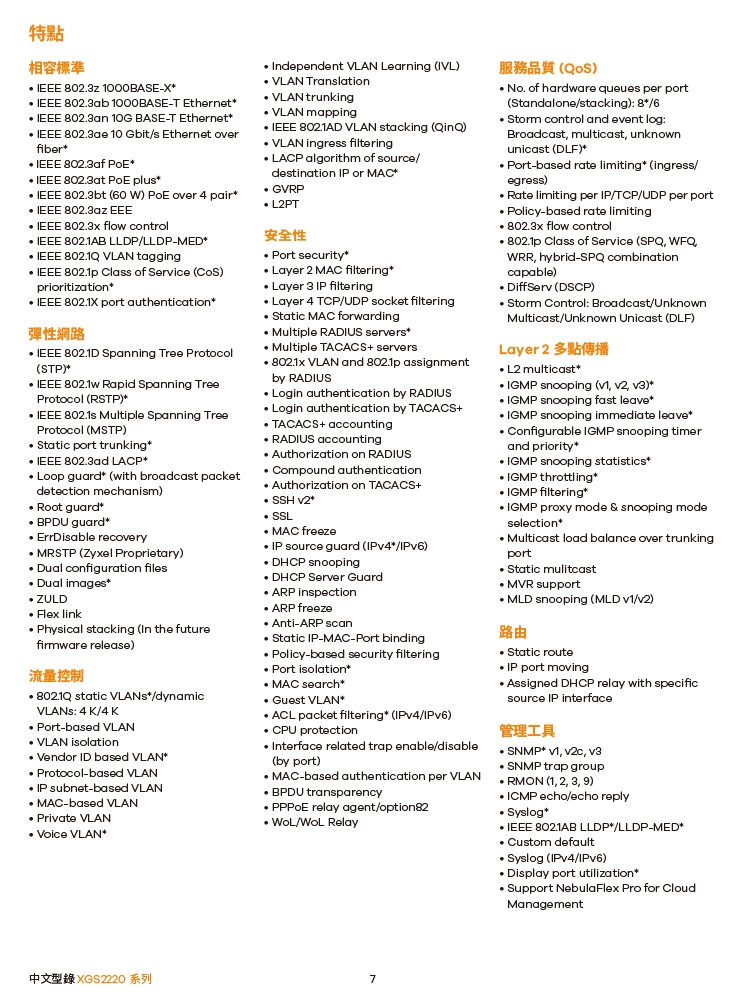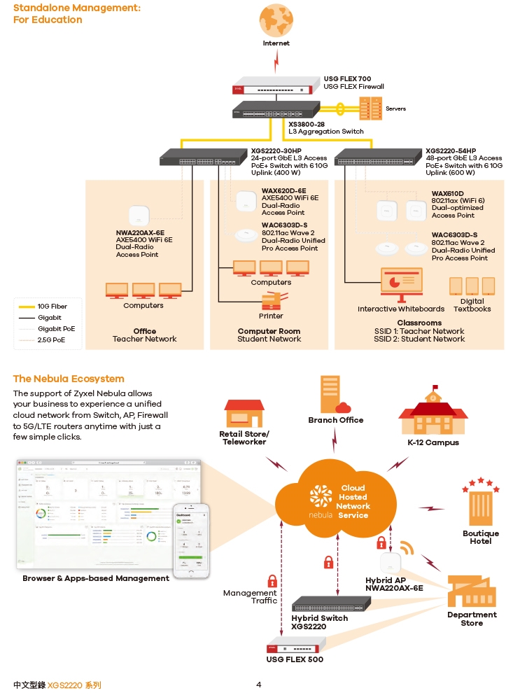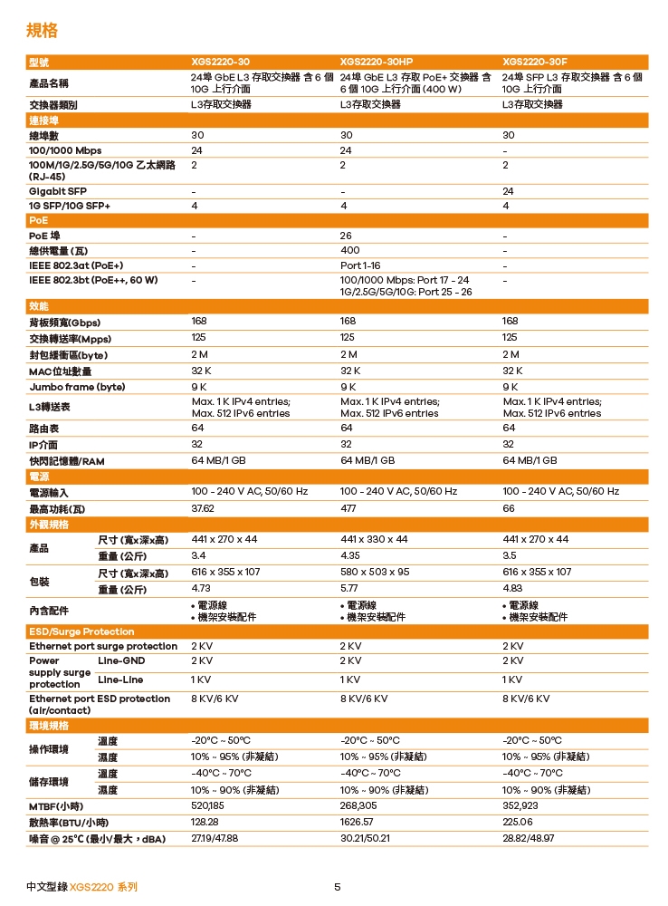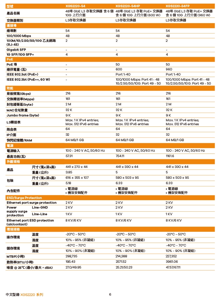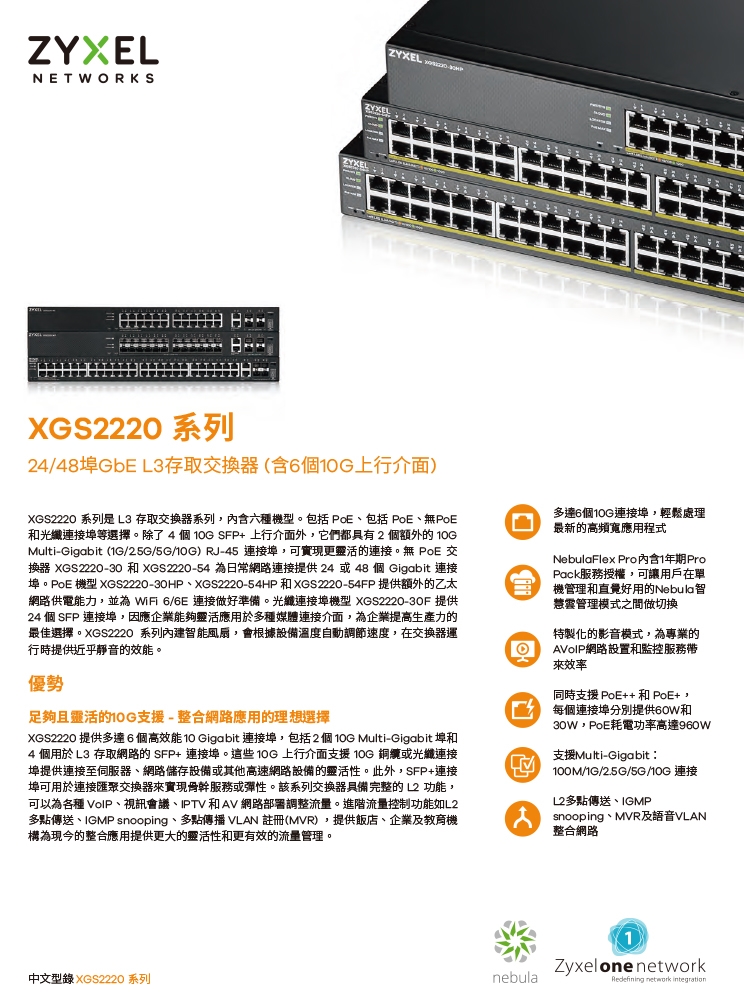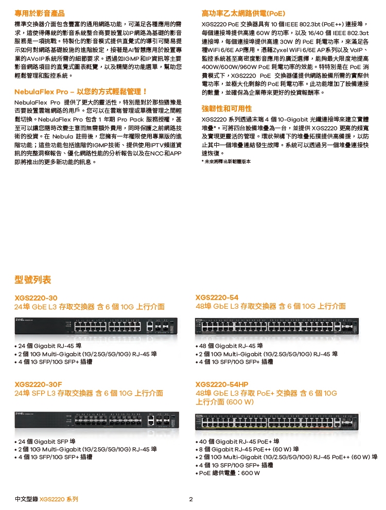 -XGS2220 系列是 L3 存取交換器系列,內含六種機型。包括 PoE、包括 PoE、無PoE和光纖連接埠等選擇。無PoE機型為日常網路連接提供Gigabit桌上型連接埠;PoE機型具有更靈活的選項,提供60 W和30 W的更大的PoE耗電功率,來滿足各種WiFi 6/6E AP應用;光纖機型主要在於實現高光纖埠口密度要求的商業連接。