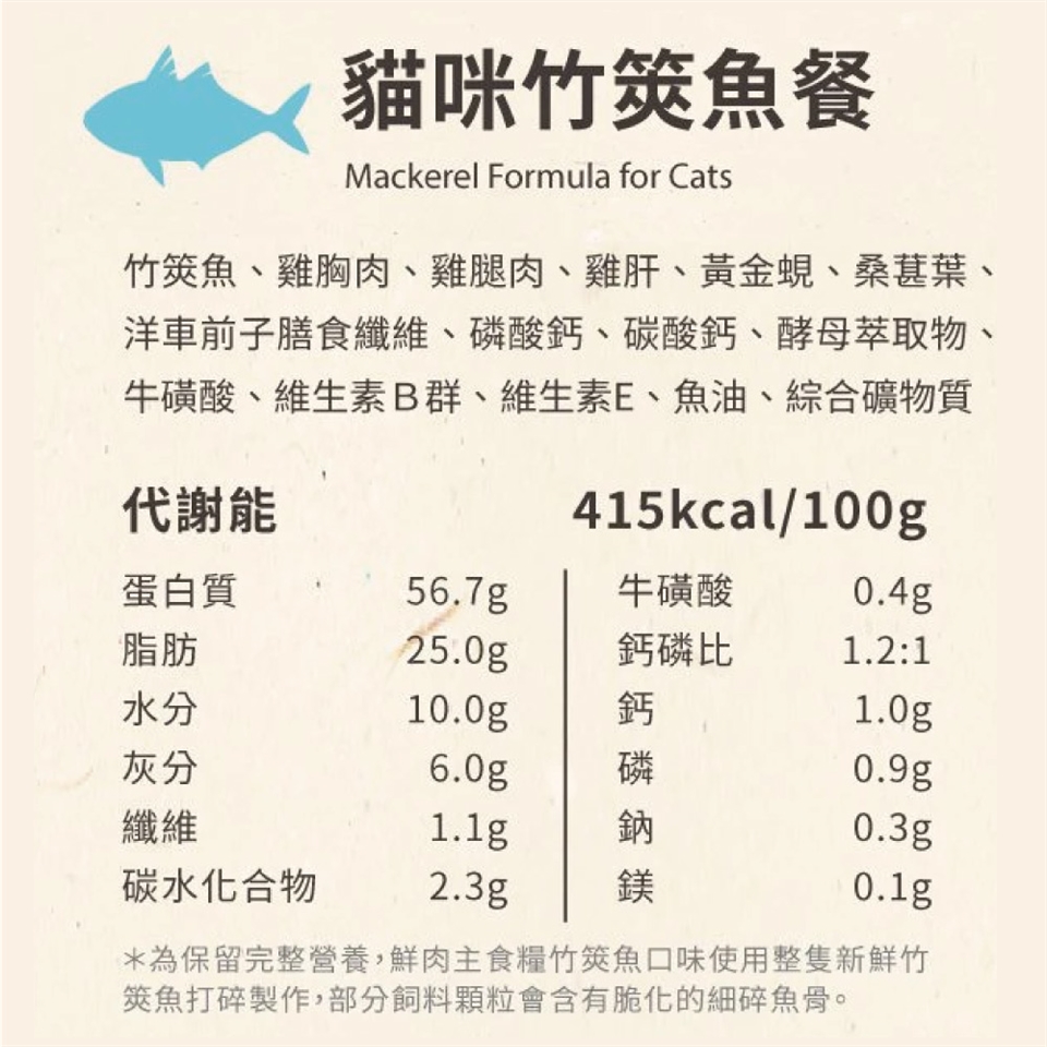 竹莢魚、雞胸肉、雞腿肉、雞肝、黃金、桑葉、洋車前子膳食纖維、磷酸鈣、碳酸鈣、酵母萃取物、牛磺酸、生素B群、維生素E、魚油、綜合礦物質
