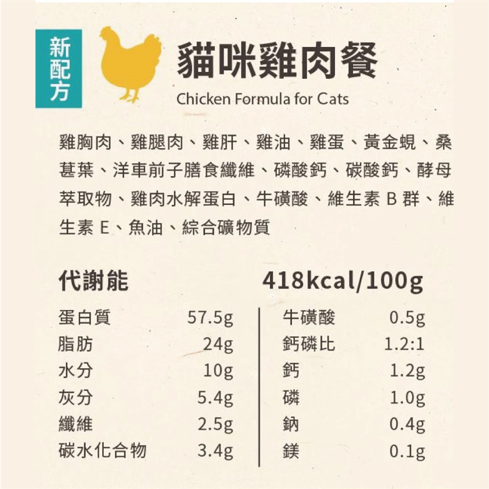 雞胸肉、雞腿肉、雞肝、黃金蜆、桑葚葉、洋車前子膳食纖維、磷酸鈣、碳酸鈣、酵母萃取物、牛磺酸、維生素B群、維生素E、魚油、綜合礦物質
