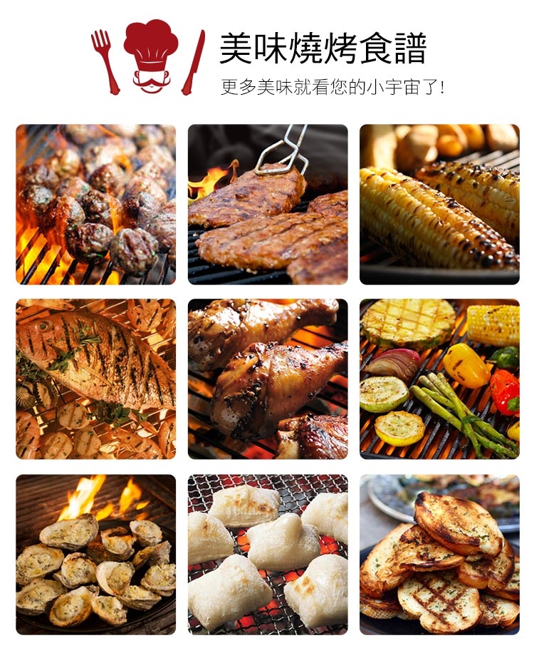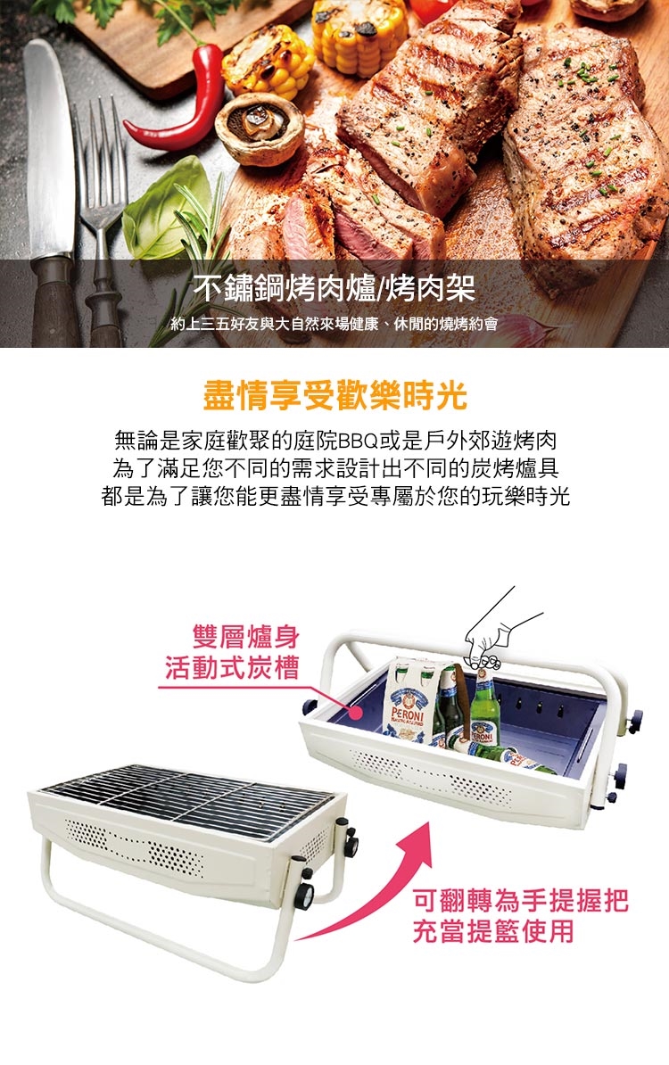 商品材質:烤網-不鏽鋼;炭網-鐵(鍍漆);爐身/支架-鐵(噴塑);管塞-聚丙烯