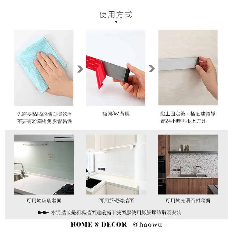 ● 3M黏膠適用牆面:木板牆、不鏽鋼牆面、光滑磁磚、玻璃面、光滑人造石、大理石