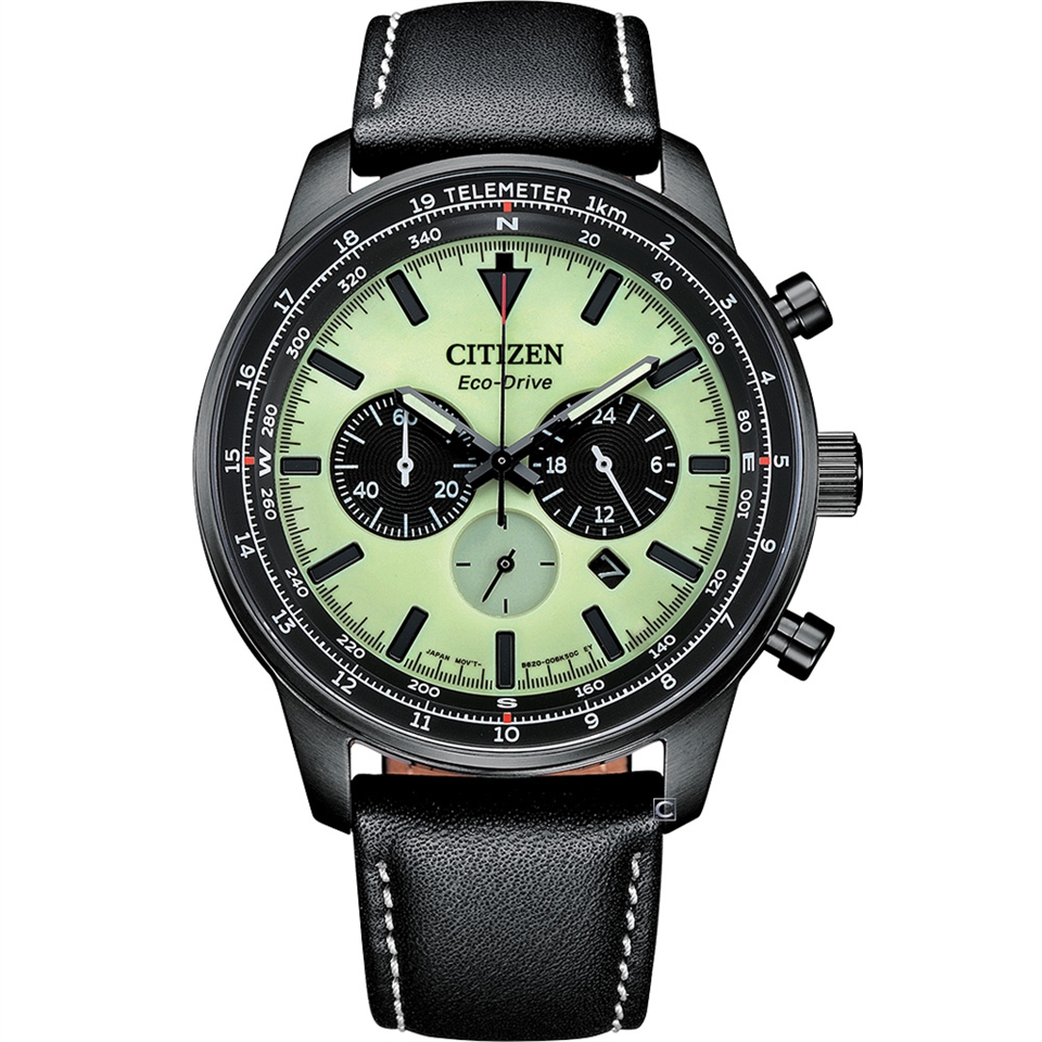 錶盤以飛行錶造型設計,錶款配備碼錶計時功能,日期/24小時制小錶盤顯示。