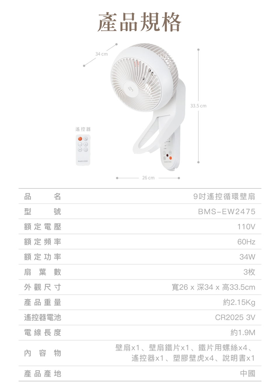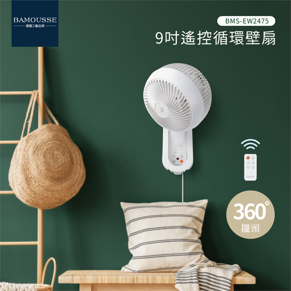 【巴慕斯 BAMOUSSE】360度擺頭9吋遙控循環壁扇 BMS-EW2475