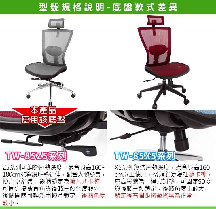 TW-85Z5全網電腦椅,採用SGS認證尼龍網面,透氣不悶熱,椅背屬於高背型樣式,本款適合身高165~180CM使用者。