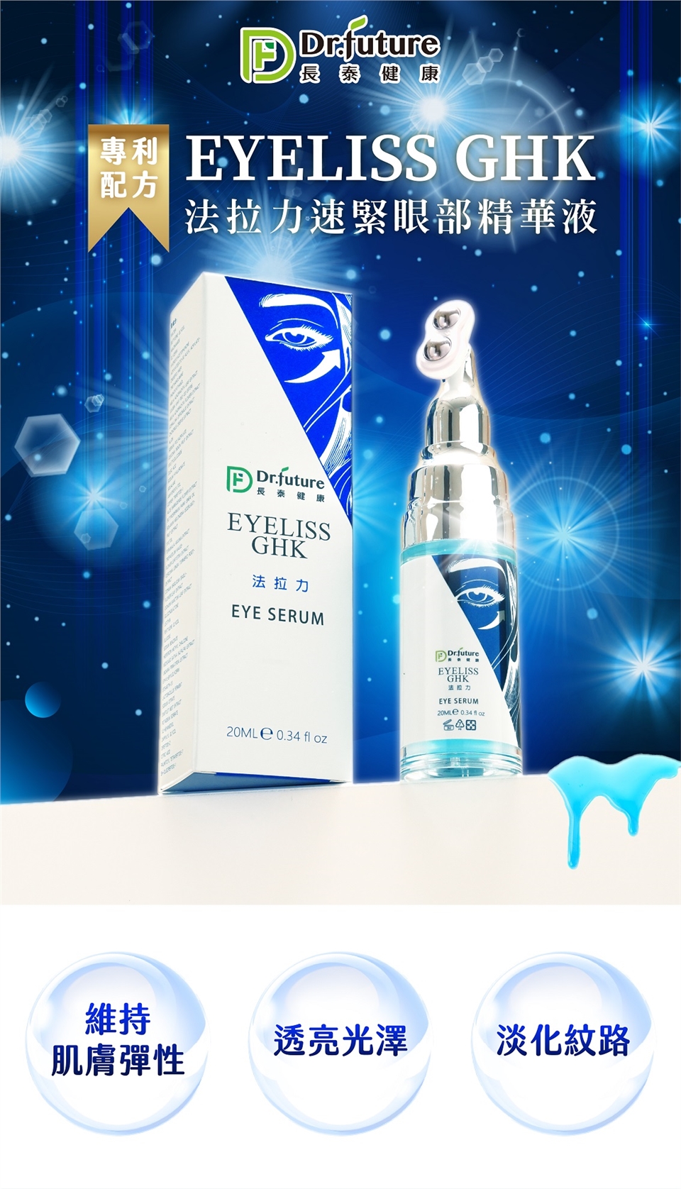 早晚臉部清潔後,壓適量精粹至按摩器上,按摩眼下、全臉及頸部肌膚至吸收即可。