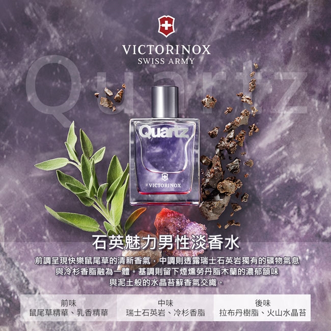 源自瑞士山脈的多層次礦物香氛,由全球頂尖香氛公司FIRMENIC H的調香大師NAT HALIE LORS ON精心調製,VIC T ORINOX推出全新男士香氛QUART Z,這款香氣的靈感來自瑞士石英岩的晶瑩剔透,散發出充滿活力和層次豐富的礦物磁性。