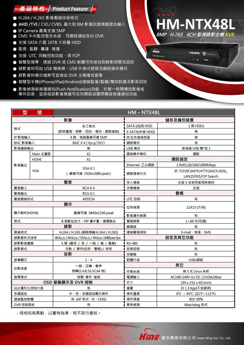 - AHD /TVI / CVI / CVBS 最大到8M影像訊號頻道混合輸入