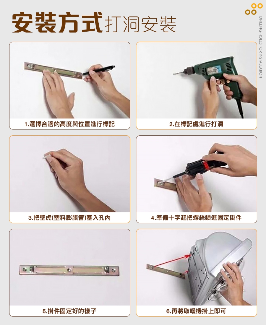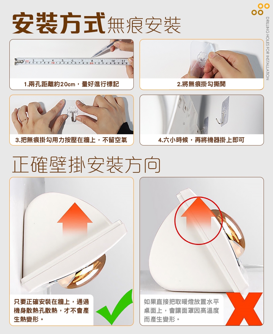 ●壁掛式只適合安裝在牆面上,不可平放在桌面上或是斜面上、加熱器不能改變照射方向