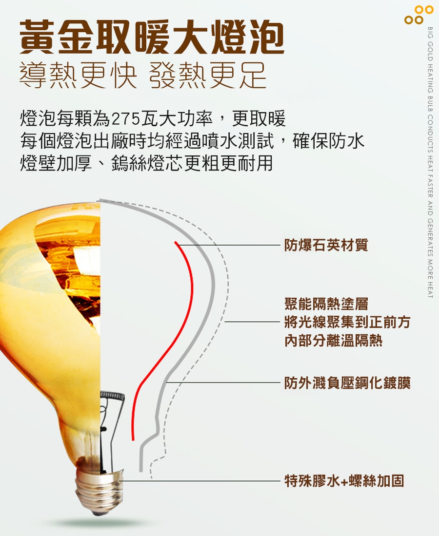 🔥 發熱更足 👉2顆燈泡更取暖、取暖範圍更大、黃金取暖燈泡每顆為275瓦
