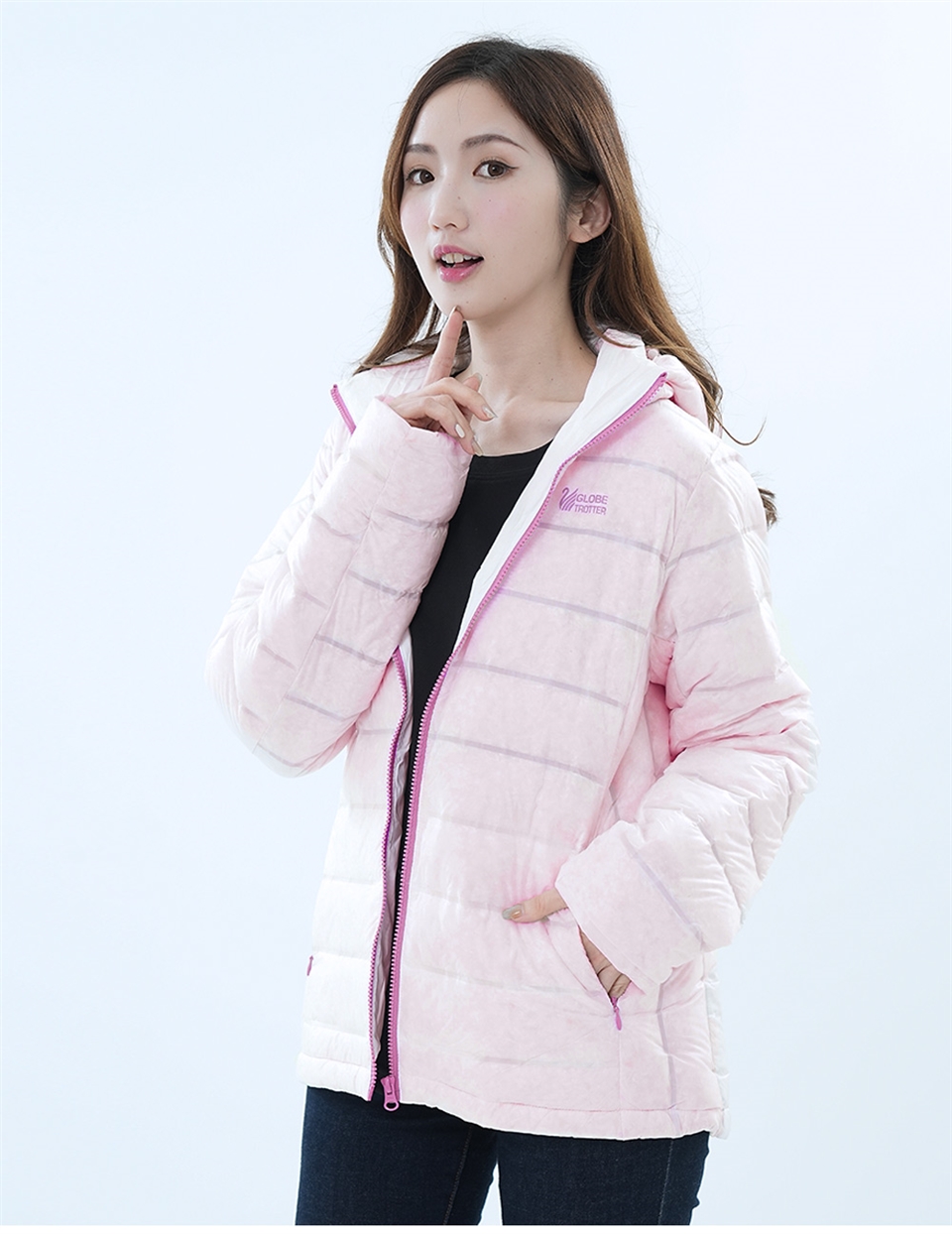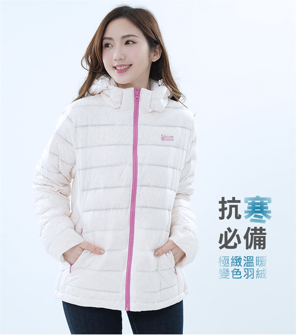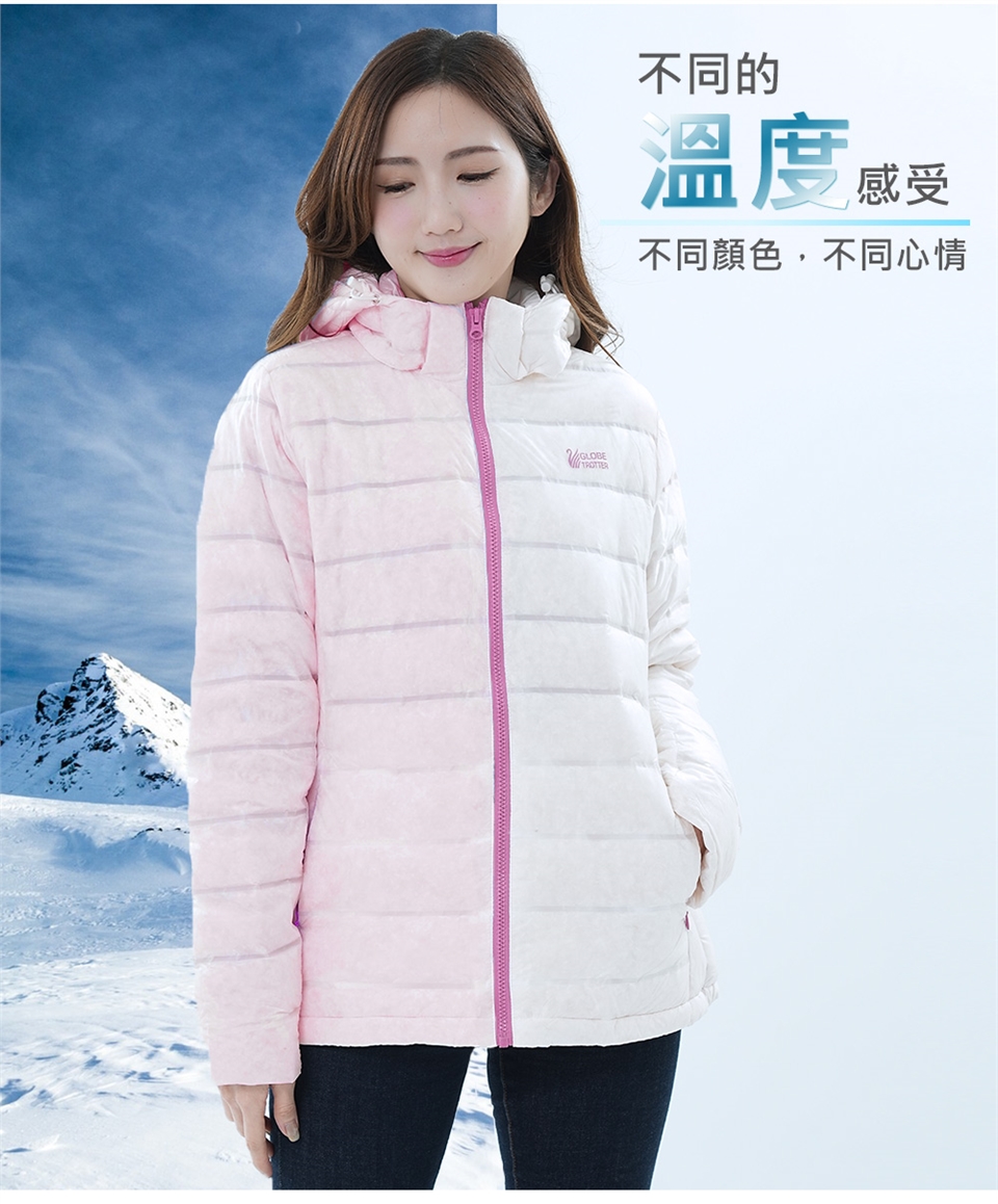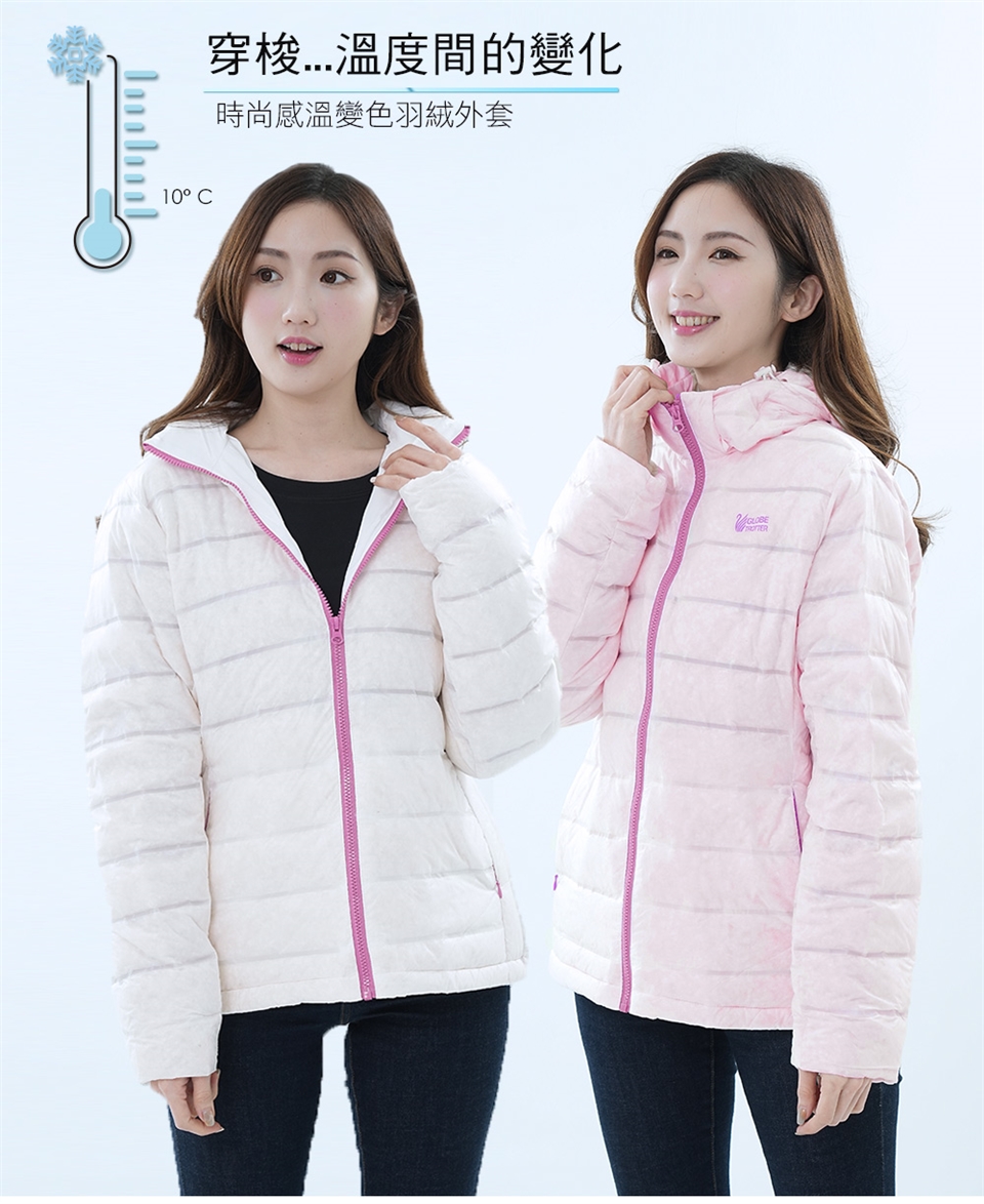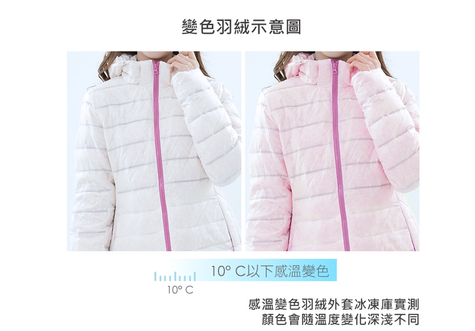 *白色羽絨外套, 隨著溫度變化, 顏色變成粉紅色