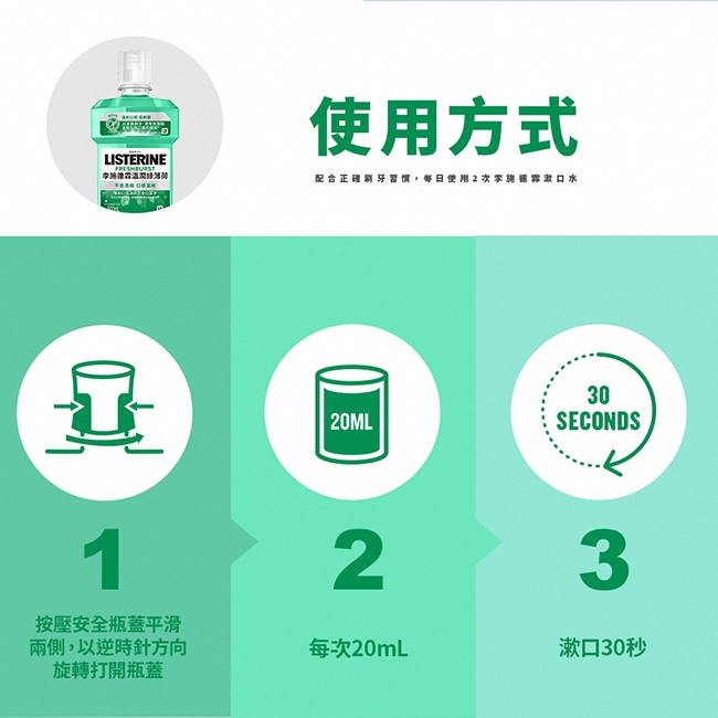 每天早晚刷牙後使用,每次20ml,漱口30秒,漱遍口腔牙縫和牙齦後即可吐掉,不需再用清水漱口