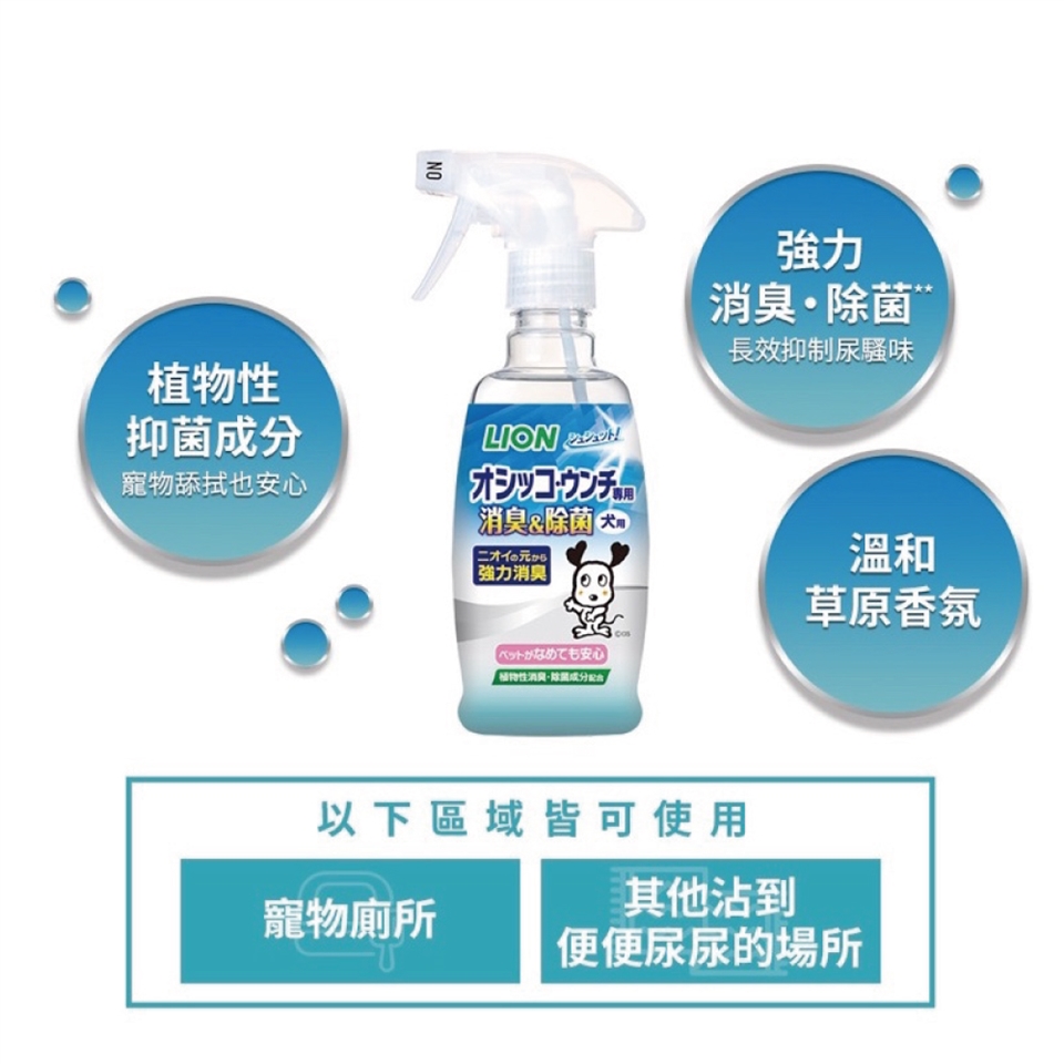 利用植物性滲透促進成分,將消臭成分帶進臭味來源,將愛犬特有的屎尿臭味強力去除。