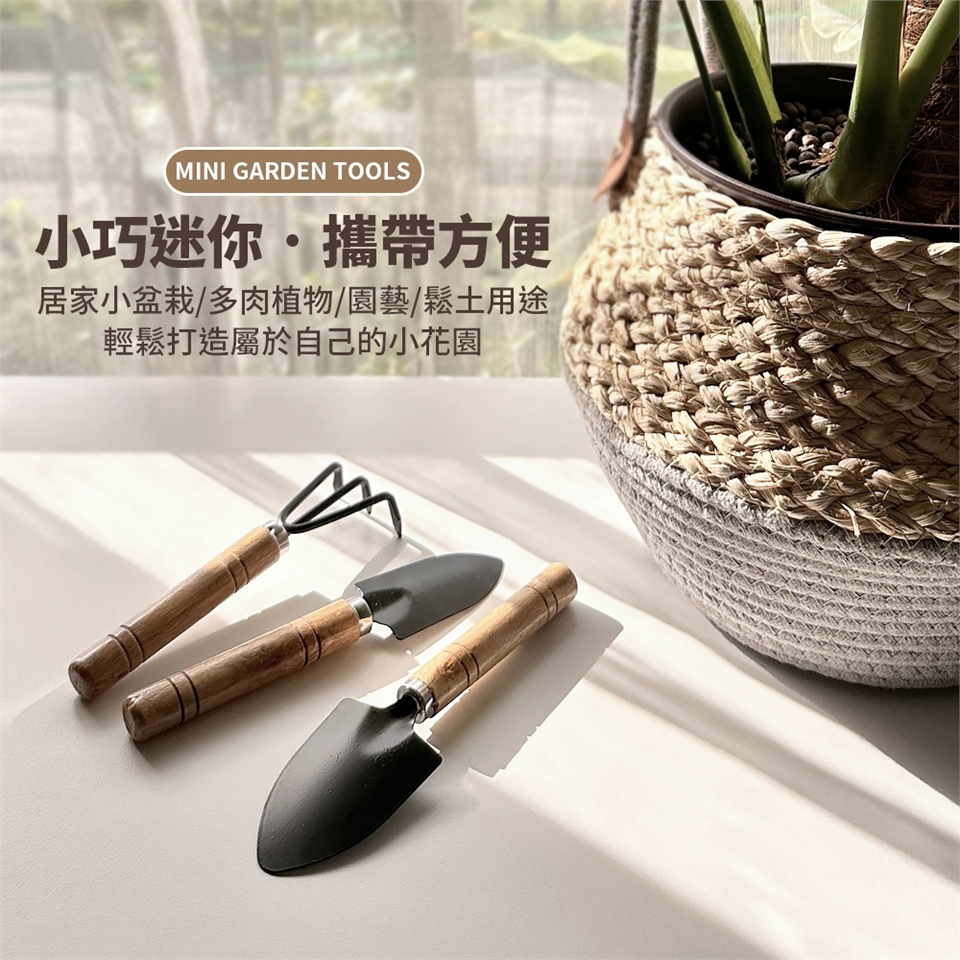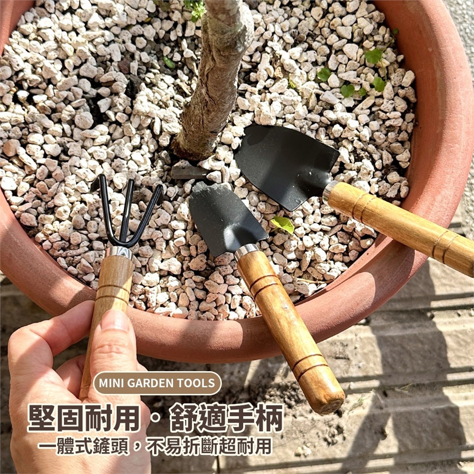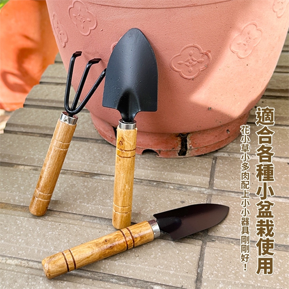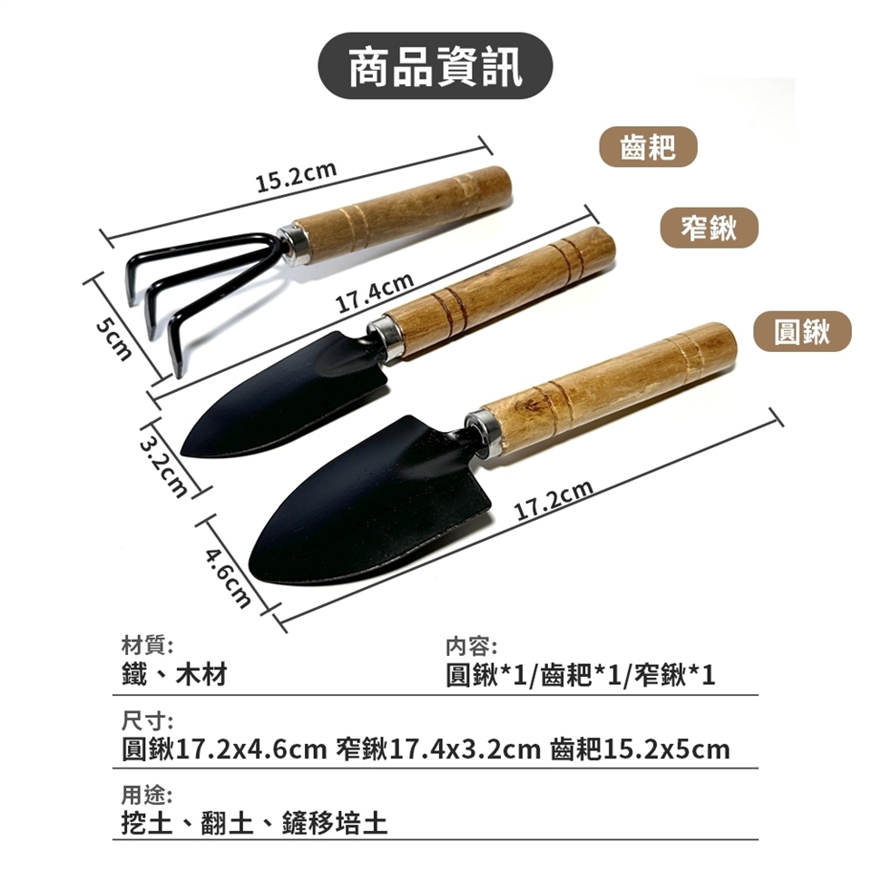 尺寸:圓鍬17.2x4.6cm 窄鍬17.4x3.2cm 齒耙15.2x5cm