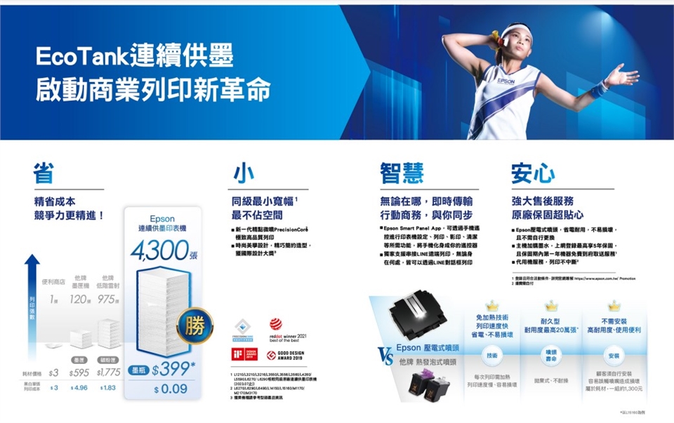 ◆ 省:成本更低省,黑色列印單張 0.09 元、彩色列印單張0.26 元