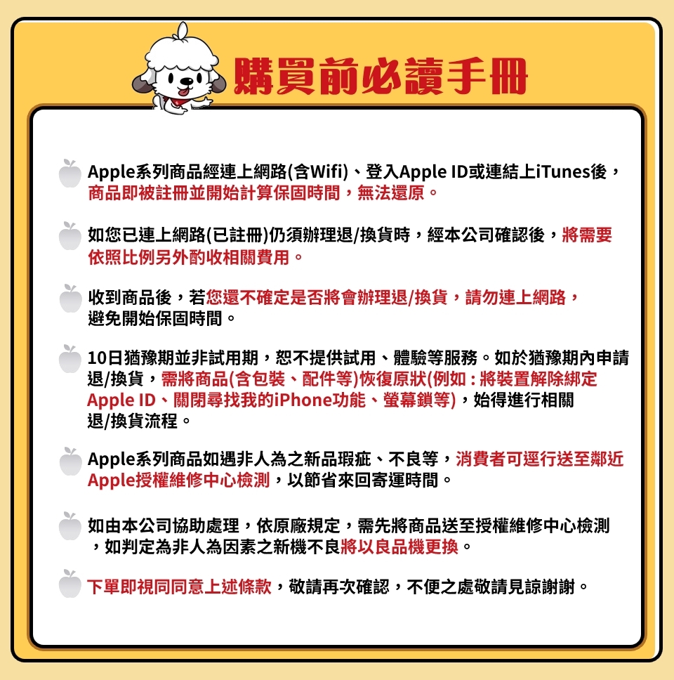 4.10日猶豫期並非試用期,恕不提供試用、體驗等服務。如於猶豫期內申請退/換貨,需將商品(含包裝、配件等)恢復原狀(例如 : 將裝置解除綁定Apple ID、關閉尋找我的iPhone功能、螢幕鎖等),始得進行相關退/換貨流程。