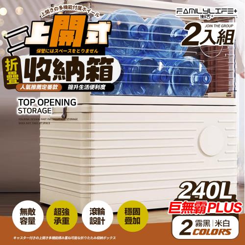 【FL 生活+】240公升上開式多功能附輪可疊加折疊收納箱-2入組(棉被/衣物/雜物/收納櫃/整理箱/A-377*2)