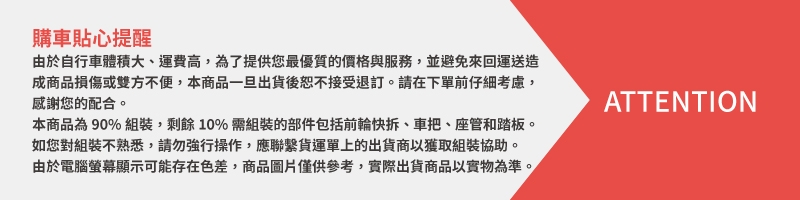 商品詳細介紹 體驗說明 不可體驗 使用方法說明 請詳盡閱讀操作手冊 注意事項 由於自行車商品體積大,運費高,為提供您最優質的價格與服務,避免來回運送造成商品刮傷及雙方的不便,本商品一旦出貨後恕不接受退訂,下單前請消費者慎思,感謝您的配合。 本商品為90%組裝其餘10%為前輪快拆、車把、座管、踏板。如組裝不熟悉,請勿強行組裝,可與貨運單上之出貨商聯絡組裝事宜。因電腦螢幕略有色差,商品圖片皆為參考,出貨以實際商品為準!