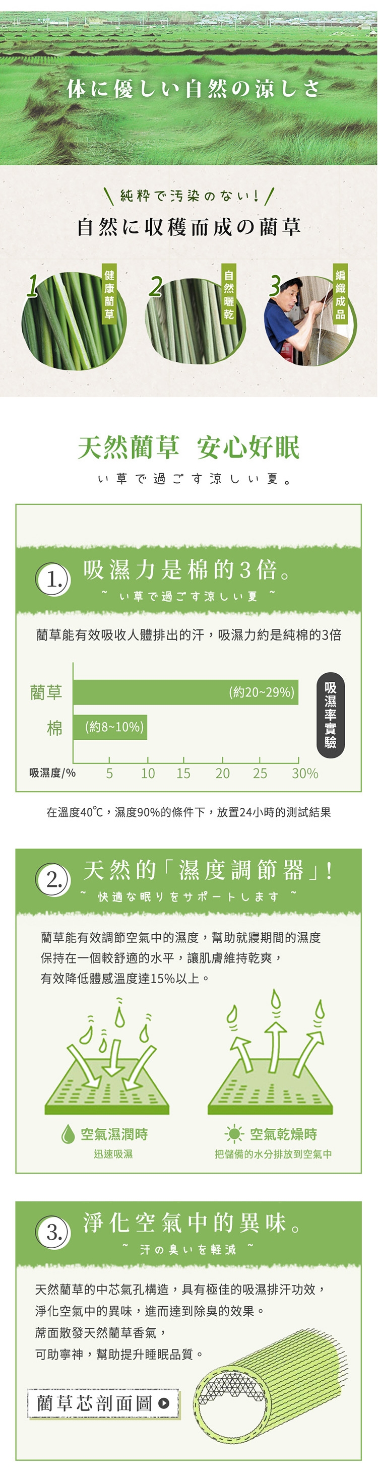 藺草中芯氣孔構造能吸附濕氣,有效淨化空氣中的異味,散發淡淡藺草香氣,可助寧神,幫助提升睡眠品質。