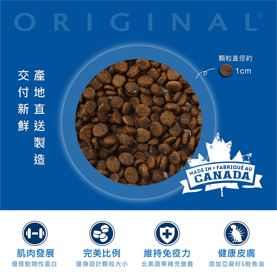 濃縮雞肉、糙米、燕麥、青豌豆、雞脂(以維生素E保鮮)、乾甜菜、天然雞肉風味、雞蛋、亞麻籽、碳酸鈣、啤酒酵母、鮭魚油(DHA來源)、藍莓、蔓越莓、胡蘿蔔、多種維生素:【維生素E補充、抗壞血酸(維生素C)、維生素A補充、菸鹼酸、泛酸鈣、肌醇、核黃素、維生素B6、硫胺素(維生素B1)、維生素H、維生素B12補充、維生素D3補充、葉酸】、礦物質:【氧化鋅、蛋白鋅、蛋白鐵、硫酸亞鐵、蛋白銅、硫酸銅、蛋白錳、氧化錳、碘酸鈣、亞硒酸鈉】、氯化鉀、DL-蛋氨酸、卵磷脂、鹽、牛磺素、菊苣根萃取物、氯化膽鹼、酵母萃取物、L-離氨酸、絲蘭萃取物、鳳梨萃取物、鹽酸鹽葡萄糖胺、硫酸軟骨素營養分析: