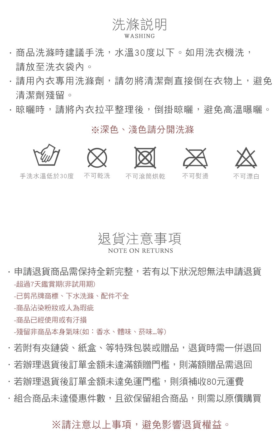◆內衣褲屬貼身物品,辦理退換貨時,除商品本身瑕疵外,一經剪標或下水恕不接受退換貨。