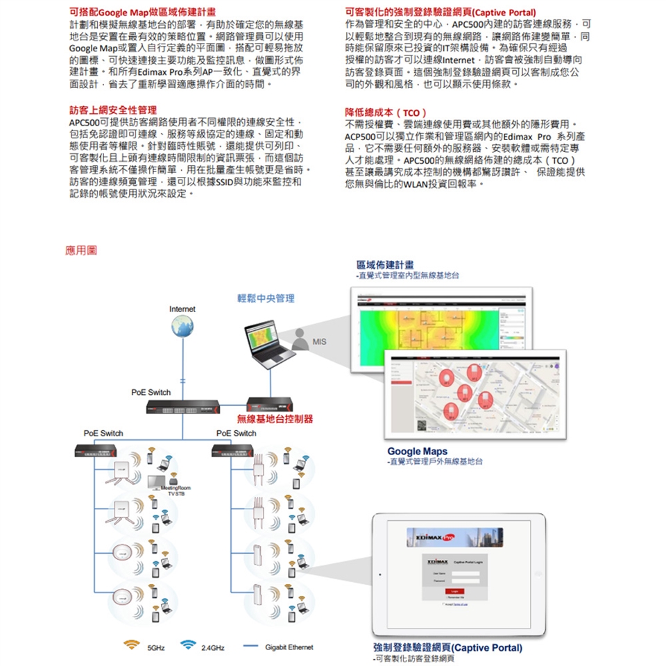 • RF管理: 可搭配Google地圖做圖形佈建計畫,輕鬆規劃AP佈建模擬、