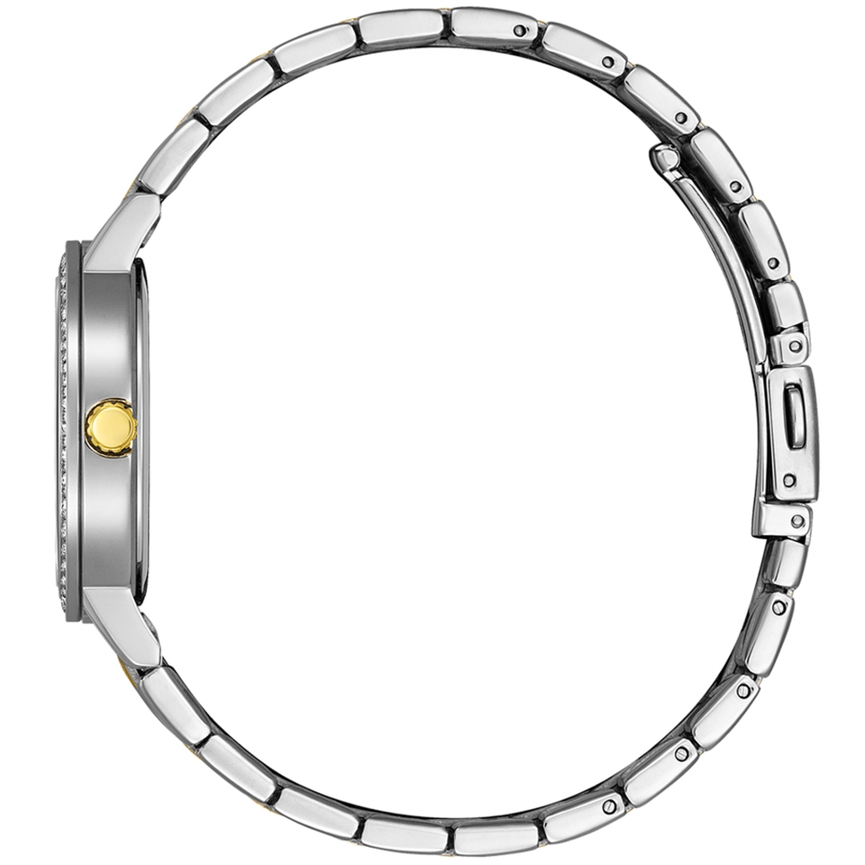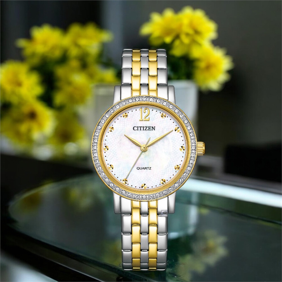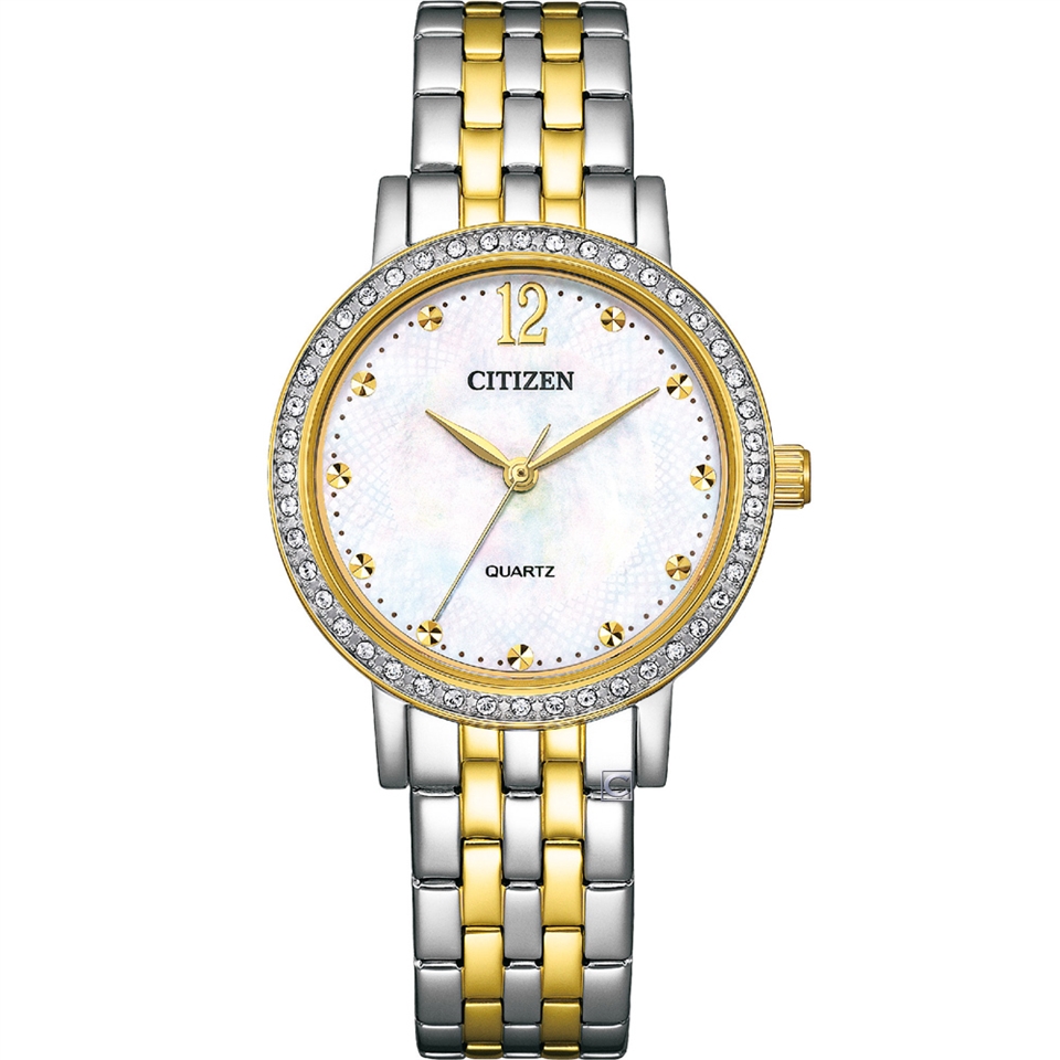 公司貨,2年保固面盤為珍珠母貝錶盤錶框鑲飾44顆水晶不鏽鋼錶殼、錶帶料號:EL3104-54D流露著璀璨時尚風的CITIZEN 星辰LADY'S 時尚女錶 EL3104-54D錶款,