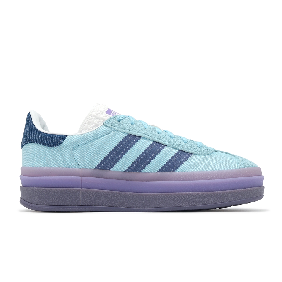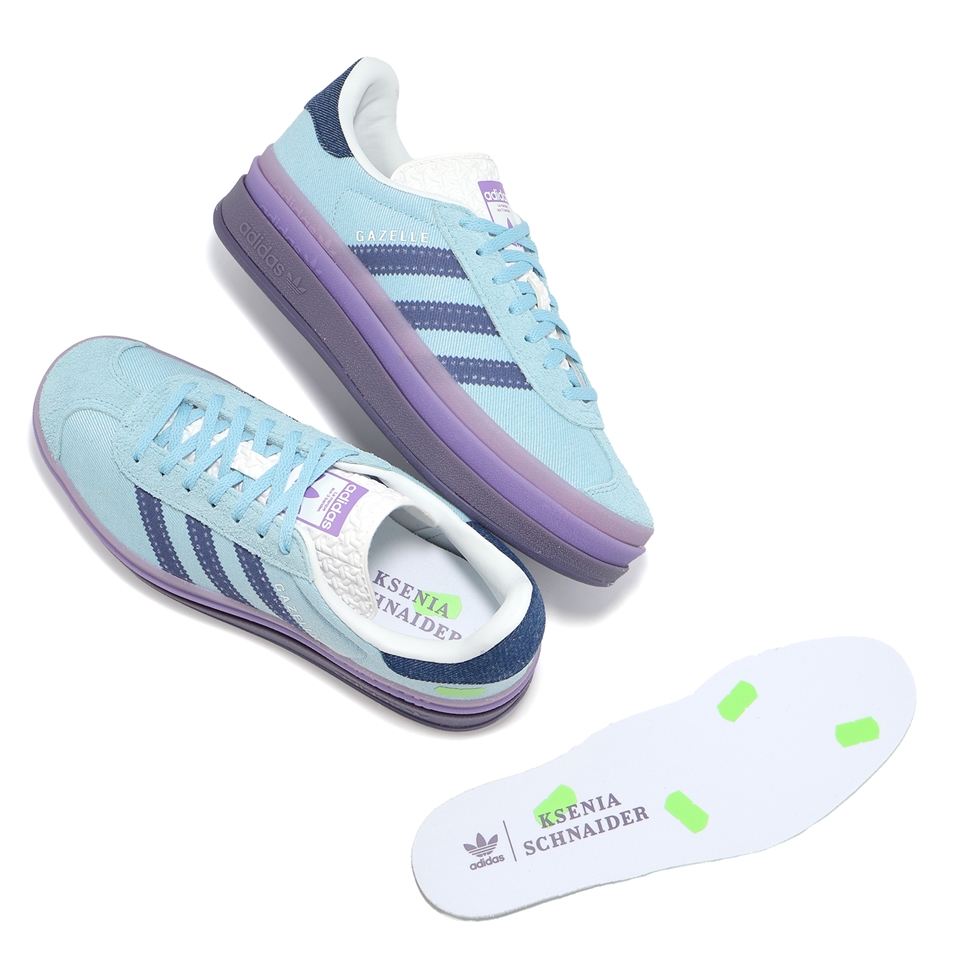 * 與烏克蘭丹寧品牌 Kseniaschnaider 聯手打造鞋款,以牛仔布料設計鞋面,搭配麂皮與紫色中底襯托出經典風格,後跟印有品牌綠標 Logo。
