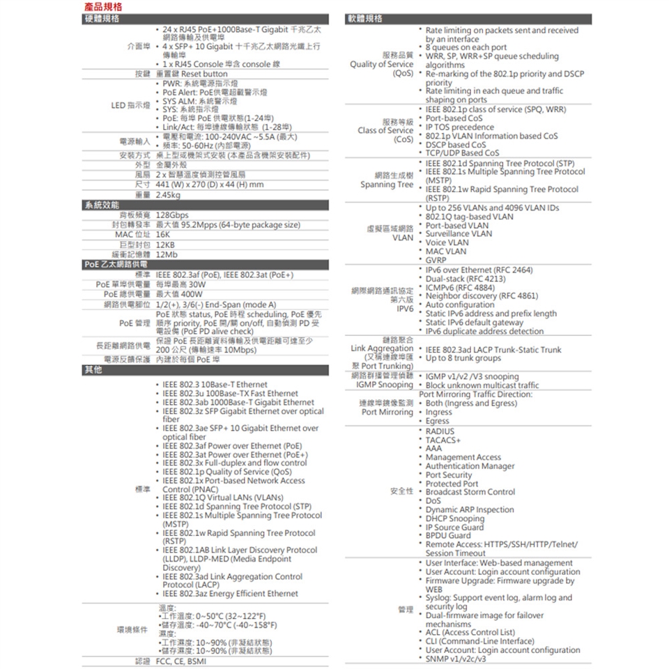 • PoE+ 埠符合 IEEE 802.3af/at 標準,最高每埠可提